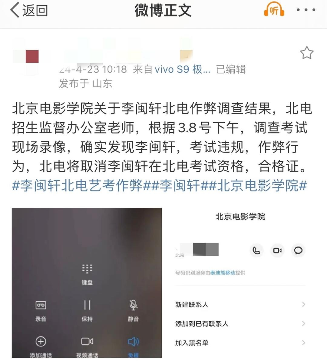 4月23日上昼,有博主爆料称,在某平台有500多万粉丝的网红李某某,在参预北京电影学院检察时舞弊,“探访检察现场摄像,确乎发现李某某检察违规舞弊活动,北电将取消李某某在北电检察经验,及格证。”该博主还在推敲区称,北京市教委已监督北电探访此事。