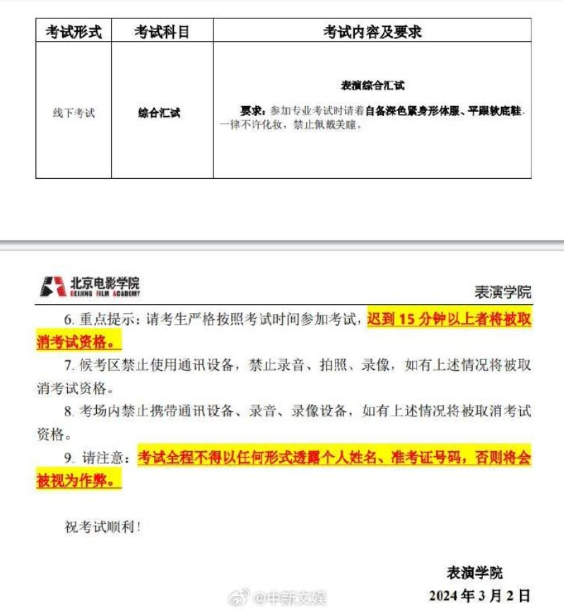 据中新娱乐,北京电影学院本科招生网有关文献夸耀,北电明确条款艺考经由中,考生须身穿深色形骸服,且弗成以任何体式夸耀姓名,不然视作违规。然而据同科场考生夸耀,李闽轩本日穿了淡色形骸服并自曝姓名。